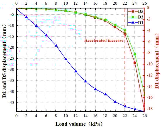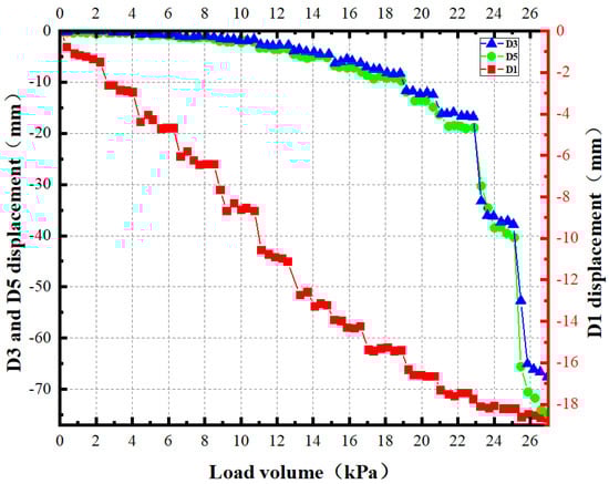 As shown in the figure, point D1 is located on the inside of the platform, and its measurements results show that the settlement of the internal platform of the model continued to increase with the loading process. The settlement deformation rate in the middle part of the platform’s inner side was relatively stable and did not show any sudden changes. When the loading finished, the maximum vertical deformation at this location was about 19 mm. The D3 displacement sensor on top of pile 2 in the front row showed a consistent deformation pattern with that measured by the D5 displacement sensor at the foot of the slope in front of the landslide. Before the loading reached 22 kPa, the displacement at these two locations increased steadily with the increasing load. However, as the load increased, the micropile group’s support gradually failed and caused significant sliding deformation of the landslide. Mutations in disposal data were observed after the loading reached 24 kPa and 26 kPa. After the loading, the D3 measuring point at the top of the #2 pile in the front row showed a displacement of about 68 mm, while the D5 measuring point at the foot of the slope showed approximately 75 mm displacement.