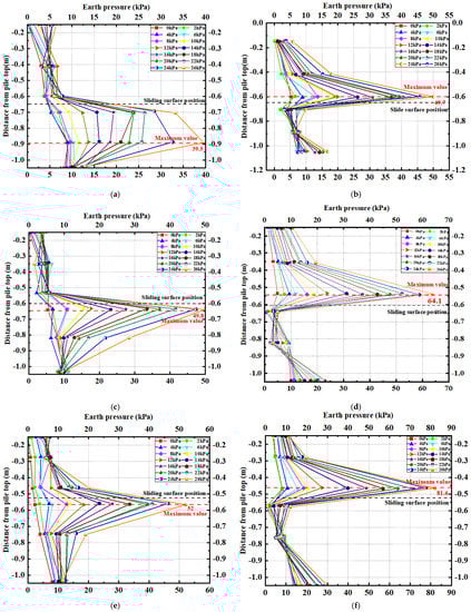As shown in Figure 10, the soil pressure distribution curves for each row of micropiles are shown for both the front and back. The soil pressure distribution patterns are consistent at the front and back of the micropiles. The soil pressure behind the pile is mainly concentrated in the loaded section and follows a triangular distribution that increases with loading. The force characteristics of the pile-embedded segment below the sliding surface are primarily determined by soil resistance induced by pile deformation under load. The distribution curve of the soil pressure in this segment also approximately follows a triangular distribution pattern, which increases with the increase in loading.