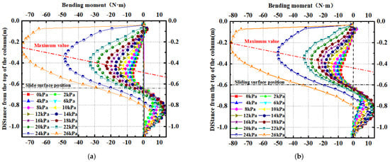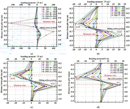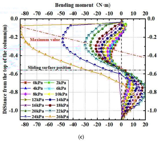 As shown in Figure 11, the bending-moment distribution curves of each row of micropiles are presented (with the convention that the tension on the pile body facing the sliding side is positive). Figure 11a shows the bending-moment distribution curve of the #2 pile in the front row, which reveals that the bending moment of the micropile significantly increases after surpassing the critical failure load, and its value is much greater than the maximum bending moment at the critical load of 22 kPa. In order to avoid the influence of the latter two loading conditions on the analysis of the bending-moment distribution of the micropiles, the subsequent data processing removes the loading conditions of 24 kPa and 26 kPa temporarily and only analyzes the conditions before the critical failure load.