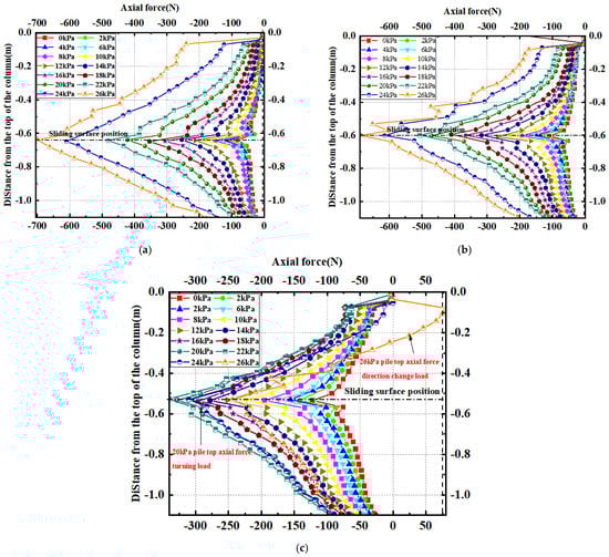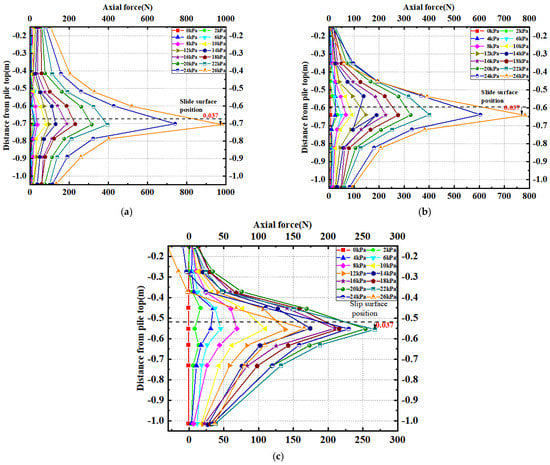 Figure 12 shows the axial force distribution curves of each row of mini-piles. It can be seen that under the action of the load, the axial force of the mini-piles mainly exhibits compressive stress. The axial forces in each row of piles are roughly distributed in a “V” shape, and the maximum axial force appears near the sliding surface, which is about 0.037 m (about 1 times the diameter of the pile) below the sliding surface. The relative magnitudes of the axial forces of each row of mini-piles differ greatly from the bending-moment curve, showing that the axial force of the front row of mini-piles is greater than that of the middle row, which is greater than that of the rear row. For example, at a load of 22 kPa, the maximum axial force of the front row of mini-piles is about 394.6 N, the middle row is about 390.7 N, and the rear row is only 276.6 N. The reason for this phenomenon can be explained by the tension and compression of the mini-piles. Comparing (a), (b), and (c) in Figure 12, the #2 pile in the front row is under compression at all levels of load; when the load increases to 26 kPa, the #6 pile in the middle row is under local tension, located near the top of the pile, while the #11 pile in the rear row is under local tension near the top of the pile when the load increases to 24 kPa, and the maximum axial force also decreases as the load increases. Therefore, it can be seen that because the sliding surface line of the pile section is not horizontal, the landslide thrust acting on the pile body also tilts with the sliding surface, and the mini-pile is not a completely horizontally loaded pile. The landslide thrust has a vertical component, which makes each row of piles basically show a state of compression. However, due to the deformation of the landslide body, each row of piles does not deform completely in coordination, which makes the rear row of piles with excessive deformation tend to experience tension and to some extent offsets the compressive stress of the pile body, thus resulting in the phenomenon that the axial force decreases as the load increases. Therefore, it can be seen that since the sliding surface line of the pile section is not horizontal, the landslide thrust acting on the pile body also tilts with the sliding surface, so the miniature piles are not completely horizontal force piles. This makes the landslide thrust have a vertical component, which makes each row of piles basically present a compressed state. However, due to the deformation of the landslide body, the deformation of each row of piles is not coordinated completely, which makes the rear pile with excessive deformation prone to tension, and to a certain extent, offsets the compressive stress of the pile, resulting in the phenomenon that the axial force decreases with the increase in the load. Many projects combine micropiles and anchors [,], but ignore the anchoring effect of the deformation of the micropiles themselves. At the top of the pile, due to the presence of the connecting beam, the top of the pile has a reliable fulcrum, so the upper part of the pile shows a tensile state. This also reflects to some extent that when mini-piles are used for landslide control, they do not completely fail after bending and shearing, but continue to resist the further deformation of the landslide in the form of tension and compression.