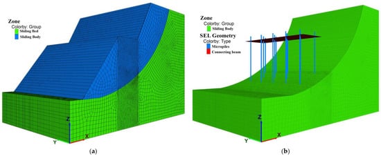 Numerical simulation calculation model. (a) Landslide model diagram. (b) Diagram of a miniature pile model.