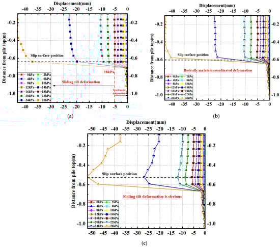 Further extraction of the deformation of the micropiles was conducted and is presented in Figure 15. It can be found that the deformation mode of the micropile body is mainly the bending deformation near the sliding surface. As the load increased, the bending deformation of the pile body near the sliding surface also increased. Overall, the three rows of piles showed similar deformation patterns, but there were slight differences. As shown in Figure 15a, the upper loaded section of the front-row piles basically maintained a coordinated deformation in a nearly vertical state until the load reached 18 kPa, but with further loading, the deformation at the top of the loaded section increased and the pile body tilted towards the sliding direction of the slope. As shown in Figure 15b, the deformation of the middle-row piles in the loaded section was basically coordinated and the pile body was generally not inclined. Observing the displacement curve of the rear-row piles shown in Figure 15c, it can be found that the deformation of the pile body in the loaded section was more complicated. When the load was small, the pile body remained basically vertical, but when the loading progressed, the displacement near the sliding surface gradually increased. Due to the constraint effect of the connecting beam at the top of the micropile, it cannot deform coordinately, and thus, the pile body in the loaded section tended to tilt towards the inside of the sliding slope.