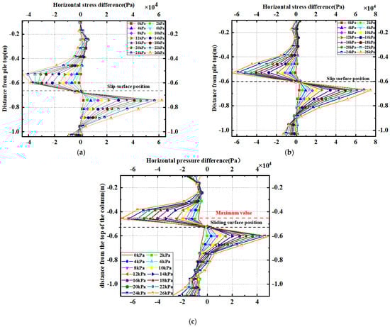 To further verify the load-sharing effect of the micropiles at different positions on the landslide, first, numerical simulation technology was used to extract the soil’s horizontal stress data before and after the pile, and then the difference treatment was carried out, and the plot was made according to the length of the pile body, as shown in Figure 16. It can be seen from the figure that the difference in horizontal stress between the front and back of the pile body was approximately triangular in distribution both above and below the sliding surface, and it increased with the increase in the load.