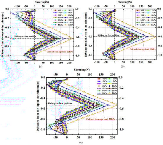 The shear force distribution curves of each row of piles are shown in Figure 18. The shear force distribution pattern of each row of micropiles is basically the same. With the increase in load, the shear force of each row of micropiles gradually increases. Before reaching the critical failure load of 22 kPa, the maximum shear force of the rear row of piles is greater than that of the middle and front rows, and the maximum shear forces of the middle and front rows are close to each other. However, after the rear row of piles enters the failure stage, the increase in shear force of the front and middle rows exceeds that of the rear row, and their maximum shear forces are higher than that of the rear row in terms of numerical value. In addition, there are significant differences in the shear force magnitude at the connection between the pile top and the connecting beam of the micropiles in different rows. Specifically, the maximum shear force of the front row of micropiles is the largest, the middle row takes the second place, and the rear row is the least. The maximum shear force of each row of micropiles occurs at the sliding-surface position, and the range of shear force influence increases with the increase in load. Before reaching the critical failure load of 22 kPa, the shear force influence near the sliding surface is approximately within the range of 0.26 m above the sliding surface to 0.24 m below the sliding surface (approximately 6–7 times the pile diameter interval). Due to directly bearing the landslide thrust, the shear force influence range of the rear row of piles is slightly larger than that of the front and middle rows of piles.