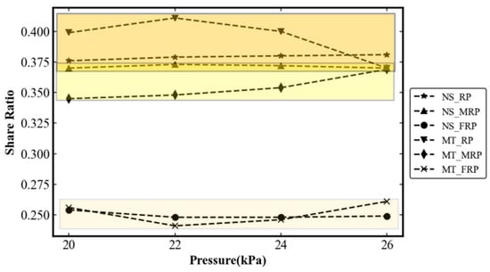 The comparison between Table 3 obtained from the model experiments and Table 6 obtained from the numerical simulation experiments shows that there is a significant sharing effect of the micropiles. In the model test, the sharing ratio is rear-row pile: middle-row pile: front-row pile = 0.411:0.348:0.241 when each row of mini-piles enters the yielding stage (about 22 kPa), while in the numerical simulation, the ratio is approximated as rear-row pile: middle-row pile: front-row pile = 0.38:0.37:0.25. Comparing the above data, it can be found from Figure 20 (NS denotes numerical simulation; MT denotes model experiment; FRP, MRP, and RP denote front, middle, and rear piles, respectively) that there is not much difference between the two and the sharing ratio is within a range of values. In the actual micropile application, the above sharing ratio can be referred to for a safer and more economical design. If the ratio is taken to calculate the assumed landslide thrust, the material of the front, middle, and rear rows of piles can be selected more safely or more economically.