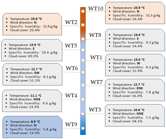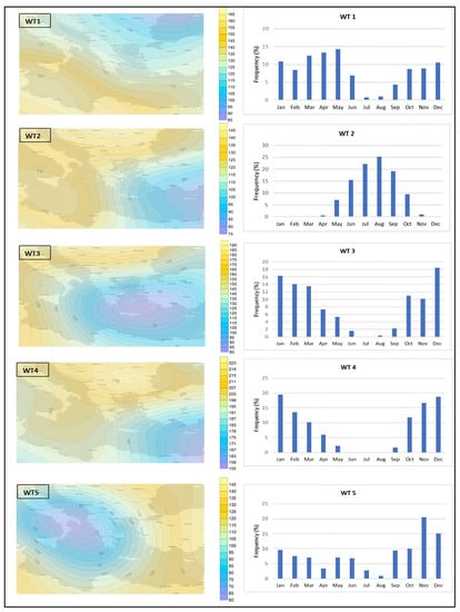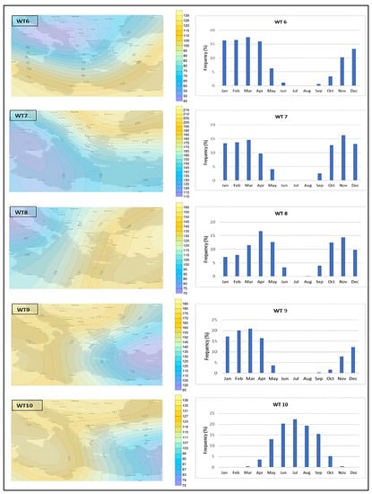 WT3, WT4, and WT9 are cold period WTs, correlated to low-pressure systems across the southeast Mediterranean, centered on the southeast Aegean Sea and Cyprus (Figure 4). During the winter, these atmospheric circulation patterns are typical and associated with low temperatures, cloud development (Figure 2), and rainy weather conditions over the Aegean Sea []. They prevail between October and May, causing a northeasterly flow over the southern Balkans, transferring cold air masses from eastern Europe, and can be related to prolonged sunshine in North Greece [].