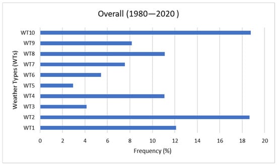 The application of components analysis on the two data sets of the wider domain and the sub-domain for the entire 41-year time period resulted in five principal components in each case (representing 88.1% and 77.3% of the total variance, respectively). The number of principal components was based on the results of the SCREE plots (Figure S3), as mentioned above. The application of cluster analysis on all 10 resultant principal components together led to 10 distinct and homogeneous clusters according to the distortion test (Figure S4). Considering that each of the 10 clusters defines a specific WT, Figure 2 displays the average values of the meteorological variables for each of the 10 WTs. The WT frequency was also investigated in the Attica region from 1980 to 2020 (Figure 3). WT 2 and WT 10 were the most frequent WTs in all seasons (average around 19% of the time), followed by WT1 (12%), WT8 (11%), WT4 (11%), WT9 (8%), WT7 (7.2%), WT6 (5.3%), WT3 (4.1%), and WT5 (3%).