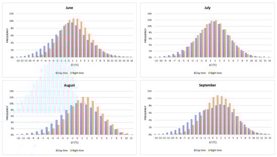 Comparing the frequency distribution, the higher frequencies of positive ΔΤi were observed during the night, especially in July and August (62%). Moreover, in all cases, the positive ΔΤi outweighed the negative ΔΤi, while in August, we observed the highest difference between positive and negative ΔΤi (62% against 27%, at nighttime).