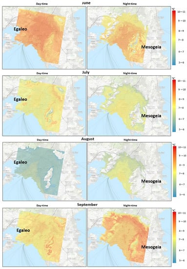 For all cases, during the daytime, hot-spots located mainly in suburban and rural areas, such as Egaleo and Mesogeia, reached their maxima in June and September. On the other hand, a thorough examination during the night in Figure 7 reveals that nighttime urban overheating hot-spots related to urban areas, including the Athens center and central municipalities of the Athens Greater Area. As for urban overheating magnitudes, nighttime hot-spots exhibited similar behavior, reaching their maximum values in early/later summer. These findings support those of Giannaros et al. (2013), who found the existence of three daytime hot-spots, at Megara, Elefsina, and Mesogeia, while in the nighttime, the city center was warmer than its surroundings []. Furthermore, this behavior is well known in Athens, as already reported in Keramitsoglou et al. []. The combined impact of the topography and surface cover features determines the urban overheating hot-spots of Athens throughout the day. For instance, Mount Hymettus is east of Mesogeia, which is bordered to the north by Mount Penteli’s slopes, including areas with sparse low vegetation, such as olive trees and vineyards, industrial zones, as well as areas covered with bare soil, such as the Athens International Airport “El. Venizelos’’. Such semi-rural environments start heating very fast during the daytime and cooling quickly after sunset due to their open exposure and low thermal surface materials. Conversely, the higher release of stored heat from urban surfaces such as concrete and asphalt causes the cooling rate of the densely populated urban environment to be greatly lowered. It is worth mentioning that high surface temperatures during heat waves may reduce the definition of these hotspots.
