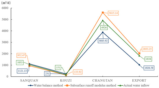 To calculate the underground runoff modulus M, LS25-3A current meter and water level gauge were used to measure the flow rate of each subzone during the dry season and calculate the underground runoff modulus. Table 3 shows the evaluation of groundwater recharge in each subzone using the underground runoff modulus method.