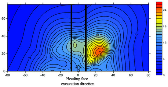 Based on the distribution equation of the seepage field around the tunnel and the water inflow data predicted by the surface runoff modulus method, the groundwater distribution state in front of the tunnel face was plotted using software. Figure 5 shows a cloud picture of the groundwater distribution in front of the tunnel face at K7+000. The central point in the figure represents the central axis of the tunnel face, with the positive direction of the X-axis indicating the right position of the face and the negative direction indicating the left side of the face. The Y-axis represents the front of the tunnel face. Analysis of Figure 4 shows that there is significant water gushing in the tunnel at K7+010–K7+030 in front of the tunnel face and should be given high priority during construction. Figure 6 shows a scene photo of water gushing at the K7+020 tunnel, where a large vertical karst pipeline is present. This karst cave is connected to an underground river, and the water supply is abundant. Measurements indicate that the maximum water gushing from this karst pipeline during a rainstorm can reach nearly 10,000 m3/d.