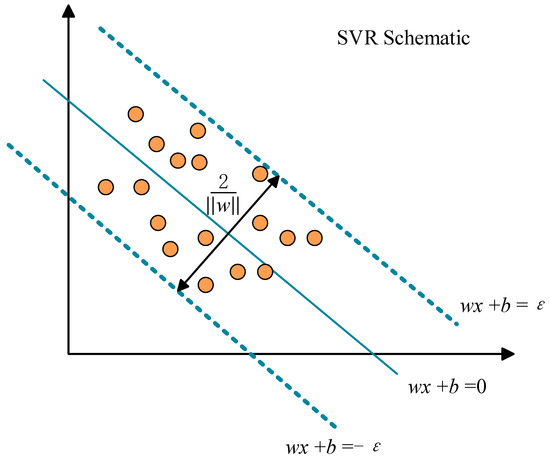 The SVR model is a way of using support vector regression, which establishes a barrier line on each side of the linear function. The distance between the barrier line and the linear function is ε, which is usually given based on experience. The samples that fall within the isolation line are not counted as losses, and only the support vectors will affect the function model. Finally, the optimized model is obtained by minimizing the total loss and maximizing the interval. The model diagram is shown in Figure 7. The circles represent the samples. For nonlinear models, kernel functions are used to map to feature space before regression, similar to SVM. Since the SVR model can perform regression analysis with a small number of samples, it is used to predict the risk level of water inrush in karst tunnels.