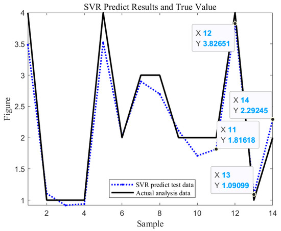 To facilitate model calculations, the risk levels in Roman numerals were converted to Arabic numerals 1–4 and software was used to train the SVR model for sample prediction. The results are shown in Figure 9 and Figure 10.