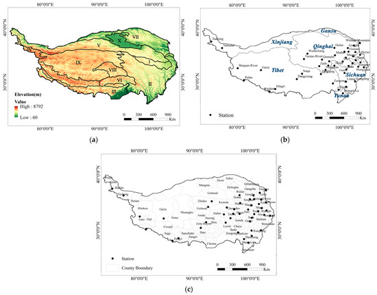 Map of the study area and the meteorological stations. (a) Elevation and zoning of the study area. I: Bayankara Mts, II: Hengduan Mts, III: Himalayas Mts, IV: Karakoram, V: Kulun Mts, VI: Nying Mts, VII: Qilian Mts, VIII: Tanggula Mts, IX: Qiangtang; X: Qaidam Basin; (b) Stations distribution in the study area; (c) County-level map of the Tibetan Plateau. The black points represent the 44 stations.