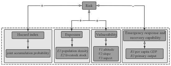 Conceptual framework of risk assessment in snow disaster. The “+” in the graph indicates a positive correlation, while the “−” indicates a negative correlation.