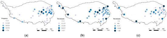 Historical spatial distribution of snow events on the Tibetan Plateau. (a) The average annual frequency of snow events (F); (b) the average duration (TAD); (c) the maximum duration (TMD).