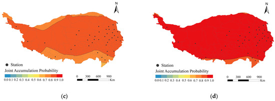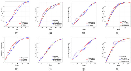 Four stations were selected as examples, namely Qingshuihe in Qinghai, Songpan in Sichuan, Zuogong in Tibet, and Shangri-La in Yunnan. At Qingshuihe, for instance, the largest p-values for temperature and snowfall were 0.98 and 0.73, respectively (Figure 4a,b); at Songpan, the largest p-values for temperature and snowfall were 0.44 and 0.71, respectively (Figure 4c,d); and at Shangri-La, the largest p-values for temperature and snowfall were 0.49 and 0.36, respectively (Figure 4g,h). Therefore, the optimal marginal distribution functions for both temperature and snowfall at these three stations were GEV. For Zuogong, the maximum p-values for the probabilistic fits of the temperature and snowfall distributions were 0.81 and 0.99, respectively (Figure 4e,f). Hence, the GEV and Gamma functions were chosen to fit the temperature and snowfall, respectively. Overall, the GEV distribution function was optimal for temperature at all 44 stations, while the optimal distribution function for snowfall was GEV at 36 stations, and Gamma distributions were used for the rest of the stations.