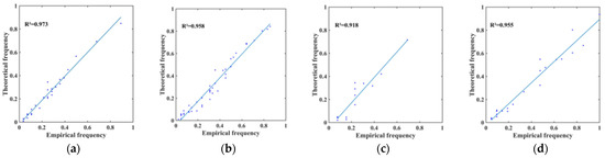 Fit plot of theoretical frequency and empirical frequency. (a) depicts the fit between theoretical and empirical frequency at Qingshuihe station, while (b–d) illustrate the fit at Songpan, Zuogong, and Shangri-La stations respectively.