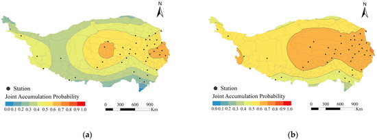 Table 3 summarizes the AIC and BIC values of different copula functions for the joint distribution between temperature and snowfall at four example stations. The Frank copula function has the smallest AIC and BIC values at Qingshuihe station, indicating that it provides a better quantitative description of the joint distribution than the other copulas. At Songpan, Zuogong, and Shangri-La stations, the optimal copula functions are the Gumbel, Gaussian, and Clayton copulas, respectively, based on their smallest AIC and BIC values. Among the 44 stations studied, 24, 13, 4, 2, and 1 stations had the optimal copula functions of Clayton, Gumbel, Frank, Gaussian, and t-copula, respectively.