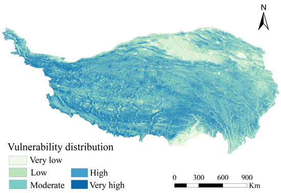 Under unchanged climatic conditions, when terrain and snow disasters combine, the terrain and landform conditions of the disaster-prone environment and the occurrence of secondary disasters can be exacerbated or weakened in most cases. Factors such as altitude, aspect, slope, and terrain shielding have a more significant impact [15,47]. After comprehensive consideration of the terrain and landform of the TP, altitude (V1), slope (V2), and aspect (V3) were selected as vulnerability indicators and divided into five levels, and the zoning results were obtained (Figure 8).