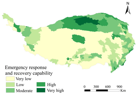Disaster prevention and mitigation capacity refers to the strength of disaster-prone areas’ ability to resist snow disasters and recover after disasters. In this paper, per capita GDP (R1) and the first industry output value (R2) were used to characterize the region’s economic development level and disaster resistance ability [48], and the results were divided into five levels to obtain zoning results (Figure 9). The larger the per capita GDP and the first industry output value, the higher the level of economic development and disaster-resistance ability of the region; this is in contrast to weak disaster-resistance ability [49].