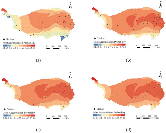 Based on the copula function’s joint cumulative probability, the distribution of snow hazards was analyzed under different joint return periods, and spatial differences were examined. For example, during the 5-year return period, the overall hazard was found to be low, located in the southeast of Qinghai Province, northwestern Sichuan, and part of the northwest of the Tanggula Mountains at the eastern foothills of the Bayankara Mountains. The hazard index (H) for these areas ranged between 0.6 and 0.7, indicating these areas to be relatively high hazard, and the total area was approximately 3.7 × 105 km2. The surrounding areas had a gradually decreasing H, with most areas in the central-eastern and western edges of the TP having an H from 0.4 to 0.6, accounting for 47.74% of the region’s area. The H less than 0.4 was mainly located on the edge of the TP and a narrow strip of the mid-west (Figure 6a).