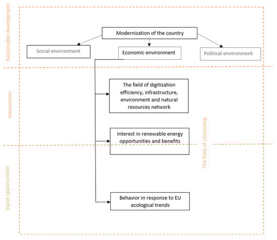According to Figure 1, three environments are identified: social, economic, and political. The economic environment covers three other areas: the efficiency of digitization, infrastructure, interoperability of the environment and natural resources interoperability; interest in the opportunities and benefits of renewable energy; and behaviour in line with environmental trends in the EU. The flowchart also contains three horizontal dimensions: sustainable development, innovation, and equal opportunities.