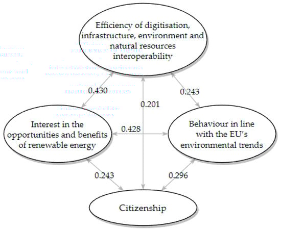 The factors in our research can be attributed to two distinct groups: ‘soft’ and ‘hard’. The soft determinants, which according to [59] refer to various attitudes, perceptions, behaviour patterns, in our study are represented by behaviour in line with the EU’s environmental trends and partially by the interest in the opportunities and benefits of renewable energy ‘hard’ determinants, which typically represent infrastructure, machinery, etc. is represented by the efficiency of digitisation, infrastructure, environment and interoperability of natural resources [60]. After factor analysis is completed, the path analysis (PA) is then performed. The result of the chi-square goodness-of-fit test indicates an exact-fitting model, χ2 = 249.12, p < 0.001. The indicators of at least an acceptable model fit [61]: NFI is equal to 0.936, RFI is equal to 0.907, IFI is equal to 0.954, TLI is equal to 0.933, CFI is equal to 0.953. RMSEA is considered an ‘absolute fit index’ and is equal to 0.49, and less than 0.05, so the network (model) is generally considered indicative of a close fit model [62,63]. The four-factor network is presented in Figure 2.