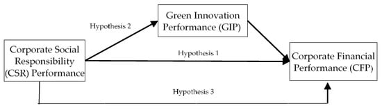 One of the concepts that can be used as a mediator and mechanism to explain the relationship between CSR and CFP is green innovation. Innovation is an important factor for firms’ success in the long term [23] and can lead to better financial performance [24]. Green innovation is an advanced version of innovation, that includes technological expansions that preserve energy, prevent pollution, recycle garbage, and design green products [25]. Green innovation is an important proactive way of contributing to environmental development, and green innovative companies are gradually leading changes in the market [26]. Therefore, attention on green innovation is vital. Previous research implies that CSR activities can help companies improve efficiency and effectiveness and enhance innovation [27]. Therefore, it is likely that CSR improves innovation, which, in turn, bolsters a company’s financial performance. Prior research suggests that innovation is related to improved CFP; however, there is little understanding regarding how CSR enhances CFP through innovation [28,29]. Herein, we analyze the “black box” of the link between CSR and CFP by scrutinizing the mediating role of firms’ green innovation performance (GIP). Specifically, our study addresses the following research questions: