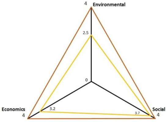 Another visualization approach using the shape of a triangle has been developed independently in two different papers—both use the same concept of visualization. While Omran et al. [23] follow the LCSA results and use the three sustainability dimensions as the three corners of the triangle (see Figure 4), Penn and Fields [24] invoke the triple bottom line created by John Elkington which include the factors people, profit, and planet. These are easily transferable to the three sustainability dimensions. Instead of profit, Penn and Fields [24] use the alternative term price which does not make a difference to the evaluation.