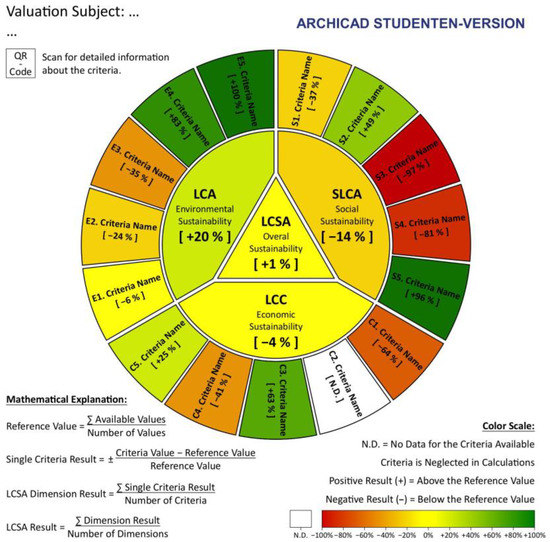 The mathematical calculations on which the results shown are based are listed in the lower-left corner of the image. The LCSA-Wheel always represents a questioned sustainability performance of a product or service in relation to a reference value/more reference values. This reference value can be another product or service the questioned one should be compared with, it can be a literature value, an official benchmark, or a value given by a database. Important is, that the reference value is clearly named and described and the respective source of information is provided. The mathematical calculations are explained in the following: First, the reference value is defined for each evaluation criterion by dividing the sum of all available reference values for a criterion by the number of these. For comparison purposes, literature values of scenario values can be used as reference values—if the functional unit, system boundaries, and full assessment are fully comparable. For LCA and LCC, the authors expect it to be easier to find reference values or even values. For S-LCA this might be a more complex and challenging task. Nevertheless, also the S-LCA values should be comparable, otherwise, the visualization in colors is not possible within the proposed LCSA-Wheel.