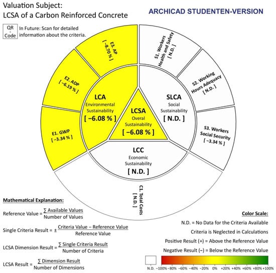 To prove the applicability of the LCSA-Wheel and provide a short example, an implementation of LCSA results for carbon reinforced concrete based on previous studies [30,31] is conducted in the following. The system boundary is defined as cradle-to-gate, and the functional unit is defined as a double wall made of carbon reinforced concrete—based on and as a continuation of a previous LCA.