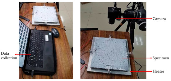 After pouring, the specimen was placed in an environment with a temperature of 20 ± 3 °C and a relative humidity of 60% until the initial setting was completed. After that, white permeable paint was sprayed on the surface of the sample, and ink dots were then sprayed on the surface of the white paint after it had dried. The sample was then left in the same environment for DIC testing. The bottom of the sample was placed on a constant temperature plate with a temperature of 30 °C to accelerate the hydration of the cement paste.