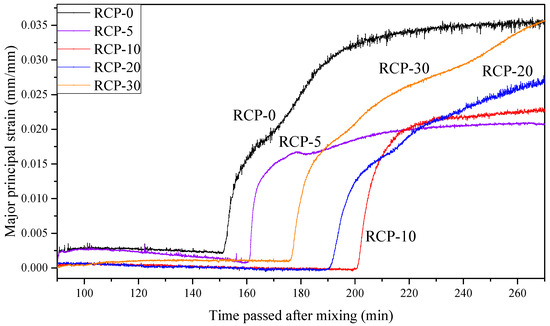 In general, for all the test conditions, the variation of the major principal strain at the midpoint exhibited a relatively small value at the beginning, which gradually increased with the passing of time. Meanwhile, the distribution of major principal strain presented a multi-peak and coexisting pattern. For the RCP-0 condition (without any recycled cement paste powder), the variation of major principal strain was not significant in the first three hours after mixing, as shown in Figure 3. The most dramatic variation of major principal strain occurred between 2.5 h and 3.0 h after mixing. At 3.0 h after mixing, the major principal strain appeared at the midpoint of the specimen, with a value of 0.01897, which was 7.6 times higher than the strain value of 0.00221 at the same position at 2.5 h. By comparing the crack status at this point from the photos, it can be observed that there were significant cracks within the range of specimens from 2.5 h to 3 h. Therefore, the appearance of cracks caused a significant change in the major principal strain. At the time point of 3.5 h, the major principal strain was 0.03242, which increased by 70.9% compared to that at 3.0 h. However, the variation of the major principal strain between 4.0 and 4.5 h was not significant, only increasing by 0.3%. Therefore, the initial stage of plastic crack formation was accompanied by a sharp change in the major principal strain, while the variation of the major principal strain tended to be insignificant after the formation of cracks within the time range.