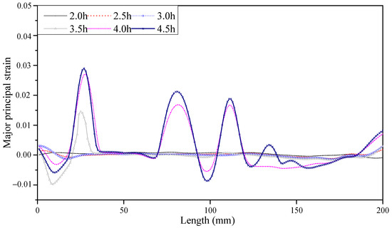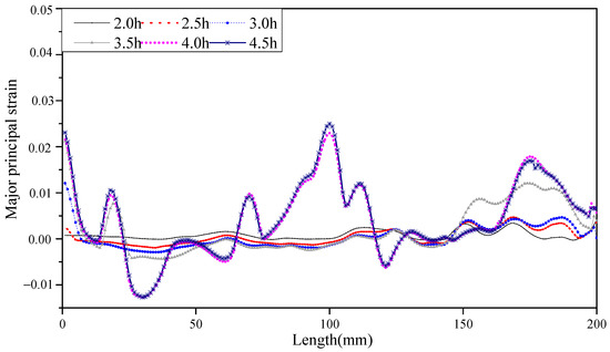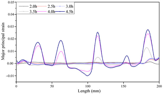 To quantitatively evaluate the variation of the major principal strain of cement paste with recycled cement paste powder in different areas of the test specimens, the major principal strain at the midpoint of the measurement specimens was selected as a reference for comparison. The selected time interval was between 2.0 h and 4.5 h after mixing. The samples analyzed included those without any recycled cement paste powder addition, as well as those with different replacement ratios, ranging from 0% to 30%, of recycled cement paste powder. The variation of the major principal strain at the midpoint line is shown in Figure 3, Figure 4, Figure 5, Figure 6 and Figure 7.