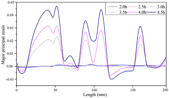 For the working condition with a 20% addition of recycled cement paste powder, the major principal stain distribution and time changes are shown in Figure 6. Unlike RCP-0, the sudden change in major principal strain occurred between 3.0 h and 4.0 h. At 4.0 h, the major principal strain at the midpoint reached a value of 0.02428, which was 95.6% higher than the strain value of 0.01241 at 3.5 h. Furthermore, at 4.5 h, the major principal strain increased by only 13.4% to reach 0.02753. Without recycled cement paste powder, the major principal strain at 4.5 h was 0.03469, and the 20% replacement ratio of recycled cement paste powder could reduce the major principal strain by 20.6%. The change in the major principal strain for the working condition with 20% recycled cement paste powder exhibited similar characteristics to the condition of RCP-0. Additionally, the addition of 20% recycled cement paste powder helped to delay the sudden change in the major principal strain and to reduce the maximum value of the major principal strain.