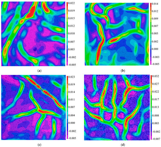 The addition of recycled cement paste affected the crack development and distribution of the cement paste specimen. A comparison was made of the distribution of the major principal strain in cement pastes under different mix proportions at a specific time. The selected time point was 4.0 h after cement was mixed with water, when the cement paste had entered the strain-hardening state. In the case of cement paste without any additives (Figure 8a), cracks had already formed and covered the entire testing area. Notably, a main crack that ran through the diagonal upper position, and a major crack parallel to the left-bottom to right-top diagonal direction on the upper left quadrant, could be observed. The cracks on the right half appeared scattered and distributed perpendicular to the left-bottom to right-top diagonal direction. When recycled cement paste powder was added under different conditions (Figure 8a–c), cracks were present in all the working conditions but with a weaker expansion than that of RCP-0. The crack distribution tended to be parallel to one side, showing a main crack with several connected small cracks. As the substitution rate increased, the correlation between cracks became stronger than that of the plain condition, and the surrounding strain extension changes were not significant. Importantly, under the condition of a 30% substitution rate, almost all cracks were interconnected and concentrated in the middle of the specimen.