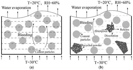 The water movement and the relationship with cement particles in the plastic shrinkage stage: (a) cement paste without recycled cement paste powder; (b) cement paste with recycled cement paste powder.