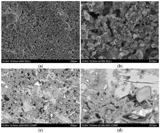 SEM results of recycled cement paste powder: (a) SEI results at 500 times magnification; (b) SEI results at 2000 times magnification; (c) BEI results at 500 times magnification; and (d) BEI results at 2000 times magnification.
