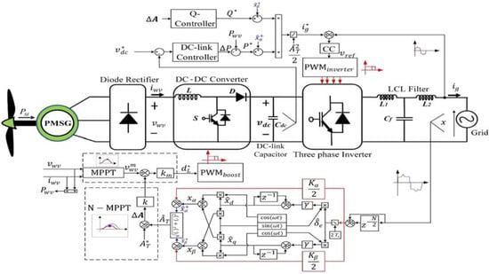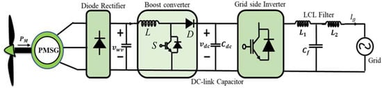 A schematic diagram of the proposed wind power conversion system (WPCS) is shown in Figure 1. A self-excited horizontal-axis PMSG with no gearbox is directly connected to the turbine blade. The generated power flows through an  network containing a diode rectifier, a boost converter, and an inverter connected to the grid with an LCL filter. The boost converter replaces the costly controlled rectifier option and steps up the variable input voltage to a stable value for the next stage. The inverter on the grid side controls active power being delivered to the grid through the LCL filter. Additionally, it regulates the reactive power exchanged with the grid by the WT to comply with LVRT conditions under grid disturbances.