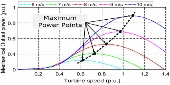 To achieve the maximum amount of power transmission, the boost converter controls the PMSG’s terminal voltage. The power curve that is utilized for maximum power point transfer (MPPT) applications in is often provided by wind turbine manufacturers []. During MPPT operation, optimal  is achieved to harness maximum power at several wind speeds with  0.441 and . Figure 2 shows the relationship between turbine speed and output power when  for different wind speeds. According to Figure 2, each wind speed achieves the maximum power at a specific operating speed. By substituting (3) into (2), the mechanical power can be equated as: