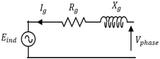 An equivalent circuit of a steady-state, non-salient-type PMSG is shown in Figure 3. Due to permanent magnets positioned in the rotor, PMSGs do not require an excitation current in the stator and are self-excited. The WT drives the shaft and converts mechanical energy into electrical energy in WPCS. There is a variation in induced back EMF in proportion to the rotor speed of the PMSG, which is equated as follows [].