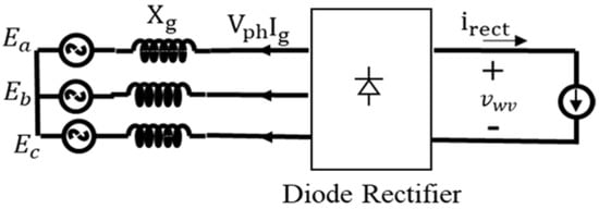 Figure 4 depicts the equivalent circuit of a three-phase steady-state PMSG connected with a diode rectifier and boost converter in the abc frame. In Figure 4, , and  are the three-phase induced electromotive voltages, and  and  are the rectifier output voltage and current, respectively. Under a steady state, the boost converter is modeled as a current source at the diode-rectifier output.