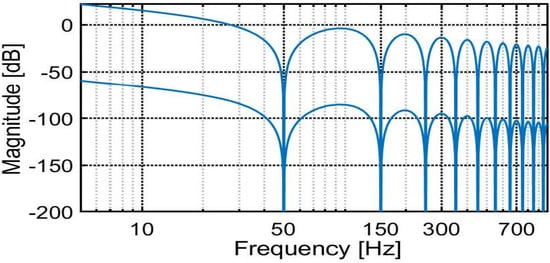 Following the delay process, the steady-state error does not exist in the estimated unknown variables (i.e., ). According to the aforementioned analysis and the exact pole-zero cancellation, the odd harmonics present in the grid voltage signal are easily rejected by the operation performed in (5), as depicted in the bode plot shown in Figure 5. However, the proposed approach may not yield proper results for a constant biased grid voltage signal.