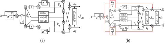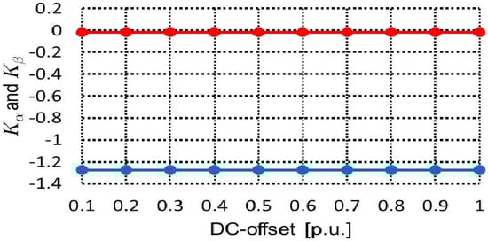 where the attenuation factors () and () are the fixed constant as shown in Figure 6. The attenuation factors for a simulation environment with various values of the DC-offset component existing in the grid voltage signal are plotted as shown in Figure 7. It is easy to infer that the  components are unequally affected by the DC-offset component.