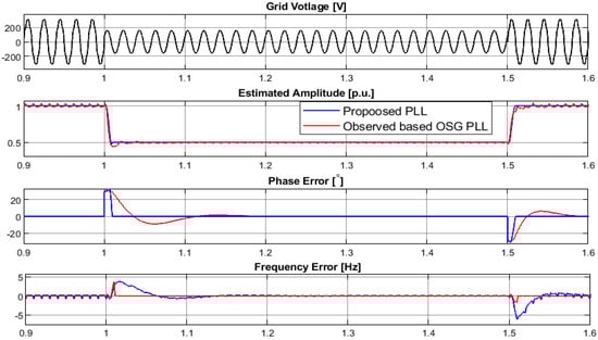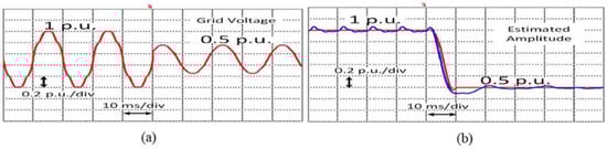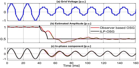 Unlike the O-PLL, the proposed ILP-PLL is capable of effectively eliminating the negative effects of harmonics and the DC offset existing in the grid voltage signal, as shown in Figure 13b, Figure 14 and Figure 15b. Robust performance is also ensured under highly adverse grid conditions, demonstrating the fast phase synchronization and amplitude-tracking abilities of the proposed ILP-PLL (in red) in comparison to the O-PLL approach (in blue) in Figure 13b, Figure 14 and Figure 15b.