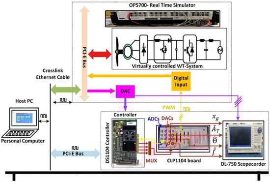 In this section, the experimental results are subdivided by considering the grid synchronization operation and the validation of the fault ride using the proposed approach for a PMSG-based WPCS. For this purpose, the component-level system is emulated using an OPAL-RT platform (OP5700), and the system parameters are presented in Table 1. Using an automatic code generation approach and a fixed sampling frequency helps to easily deploy the control algorithm to the dSPACE platform (DS1104), which acts as a real-time controller, as shown in Figure 12. The controller tuning parameters are provided in Table 2.