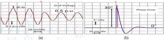 Under the low penetration of a WPCS, an MPPT scheme based on the perturb-and-observe method is employed to control the boost converter. For higher penetration of renewable energy resources in the utility grid, a large  ratio makes the low-voltage feeder network resistive in nature. Depending on the droop characteristics, a wind energy system (Figure 2) can switch between reactive power injection mode and unity power factor mode by simply varying the duty cycle of the boost converter, known as non-MPPT (N-MPPT) mode, specific to grid faults. In order to maintain a unity power factor mode, the injected grid current must be synchronized with the grid voltage, indicating that the PMSG-based WPCS is operating normally.