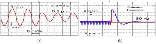 The grid voltage signal is synthesized internally within the real-time controller with nominal parameters of 1 p.u., , and  THD. The harmonically distorted grid voltage signal is subjected to  voltage, along with a  phase jump and 0.1 p.u. DC offset. The aforementioned grid voltage condition is emulated within the controller using a digital-to-analog converter (DAC), then sent to the proposed ILP-PLL, as well as the O-PLL using an analog-to-digital converter (ADC). Accordingly, the grid voltage parameters are captured on a scopecorder (DL750).