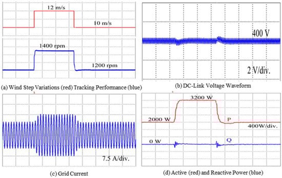 In this case study, a step change in the wind speed of the PMSG turbine is introduced to determine the stable operating behavior of the overall system. The wind speed changes from  to , then back to , as shown in Figure 16a. Note that the generator speed is easily tracked in accordance with the wind speed variations. Moreover, in both the steady and the transient states, the DC-link voltage is tightly maintained at , as demonstrated in Figure 16b. Consequently, when positive variation in wind speed occurs from , the increase in the grid current amplitude is obvious (see Figure 16c). Simultaneously, in view of the unity power factor operation of the PMSG-based turbine, the active power injection into the grid increases, without any injection the reactive power, as shown in Figure 16d. Thus, the stable operating behavior of the PMSG-WPCS is ensured with the proposed control solution.